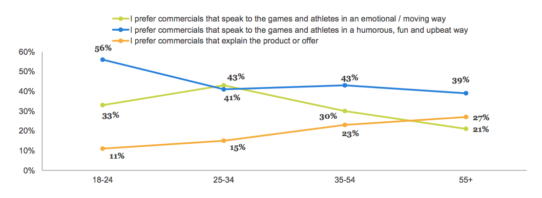 - 43 percent of 25-34 year olds prefer ads that speak to the games and athletes in an emotional and moving way