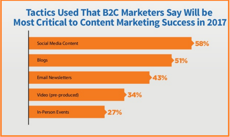 One of the most important tactics for B2C content marketing is Social Media Content with 85 percent of respondents for CMI survey for North America claiming to have used it. More than 50 percent of respondents are prioritizing Social Media and Blogs as the Content Marketing tactic for 2017 . Brand Awareness, Engagement and lead generation are the top three goals for Content Marketers over the next 12 months.