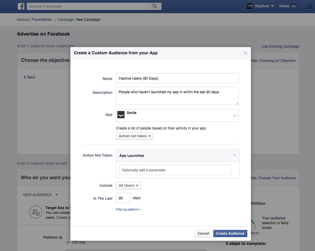Targeting Inactive Audiences with holiday season deals can bring audiences who installed the app but are not active, for a certain time-period. For example you might want to run an app ad targeting people who downloaded your app but haven’t logged in within the last 90 days. You can do so easily by creating an Ad Targeting Inactive Users for the last 90 days.