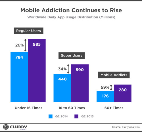 Mobile App use continues to grow and in a research published by Flurry Analytics, “From Q2 2014 to Q2 2015, the total population of smart devices measured by Flurry grew from 1.3B to 1.8B, a 38 percent year over year growth. Regular Users, consumers who use apps between once and 16 times daily, grew from 784 million to 985 million in the same period, a 25 percent increase. Super Users, consumers who use apps between 16 and 60 times daily, grew even more in that same period from 440 million to 590 million, a 34 percent increase”. According to Flurry Analytics, in 2014 overall app usage grew by 76 percent during the Thanksgiving, Black Friday and Cyber Monday.