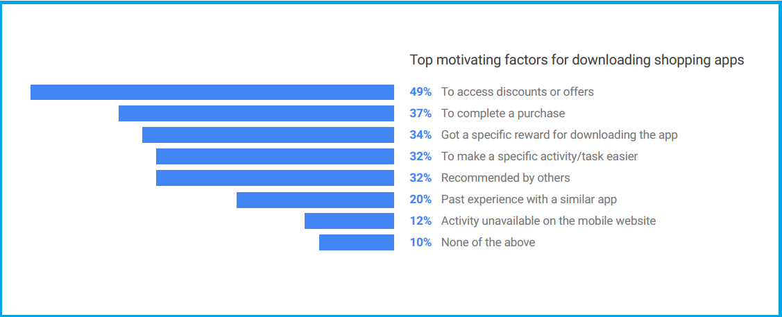 Discounts and Deals are the most important reason for the mobile shopper to download an app. The Discounts and Deals and Bonus Offers are the top motivating factors for installing an app. These are the reasons that contribute to the users returning to an app after uninstalling.